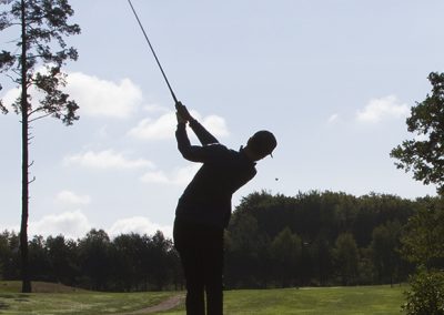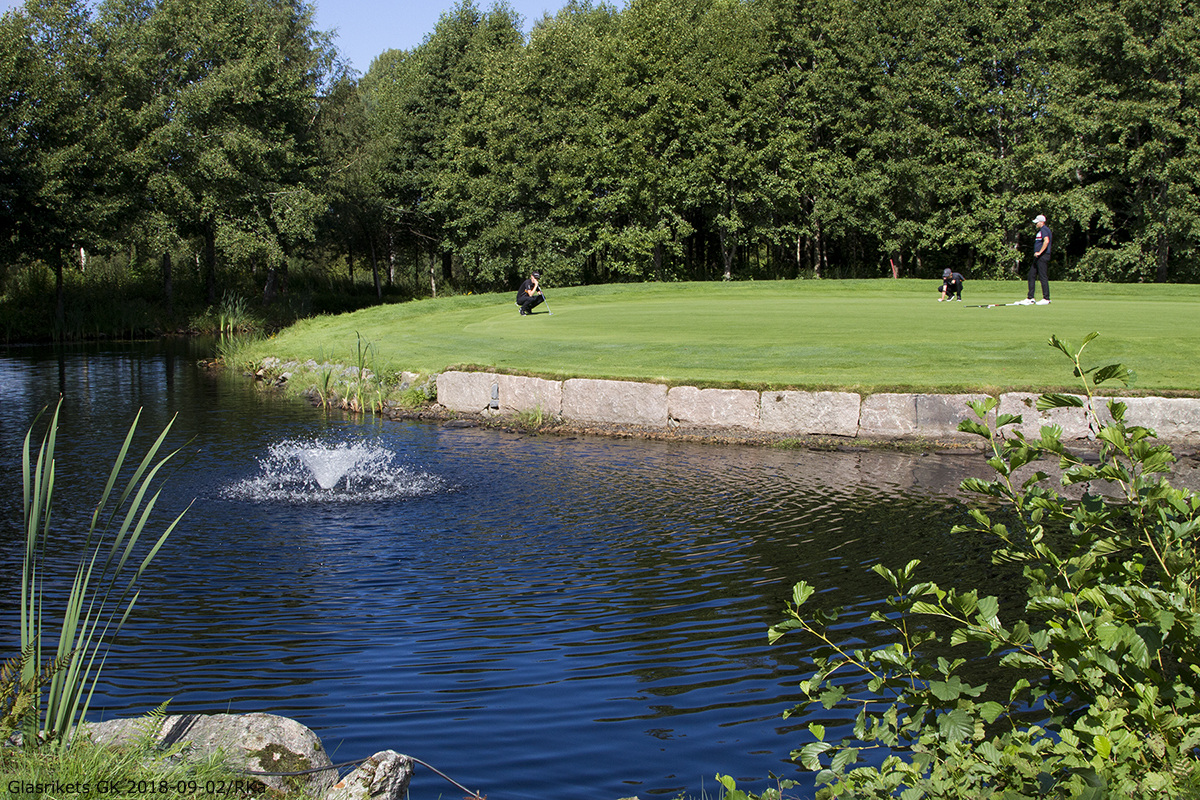 På hål nr. 8 (Ni vet där man kan köpa bollar från en automat innan man slår ut) drog han den till vänster, förbi green, klockrent i vattnet. Dropp – chipp – putt = 4 🙁